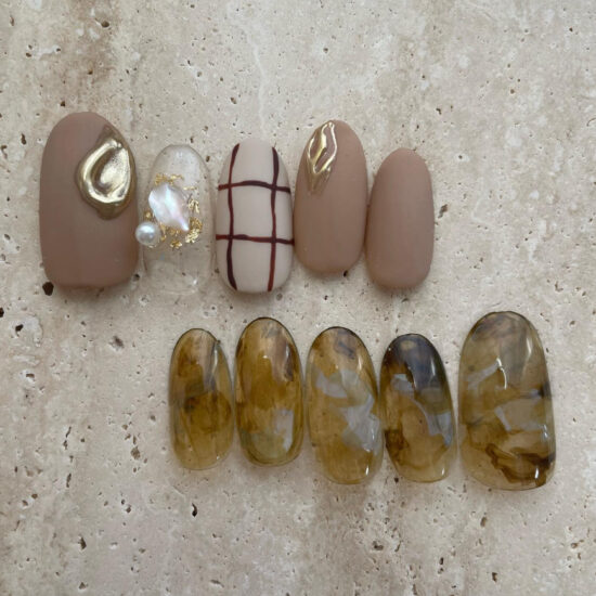 エレガントな色味にゴールドがきいた素敵なネイル♡まさにガラスのネーミングがぴったり。是非、エマネイル天満橋店さんをフォローしてみてくださいね。