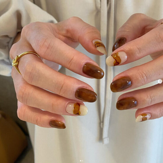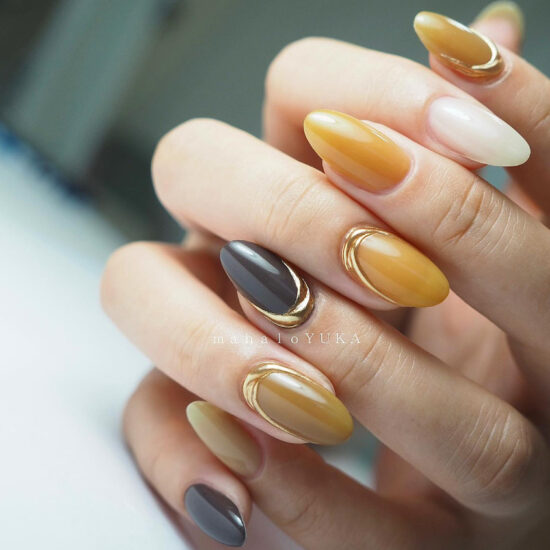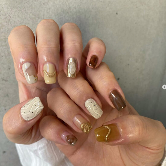 秋色にラインやゴールドのポイントがおしゃれなネイル♡べっ甲のようなでもモダンのような色味もシックで素敵♡是非、lapis_by_louisnail さんをフォローしてみてくださいね。