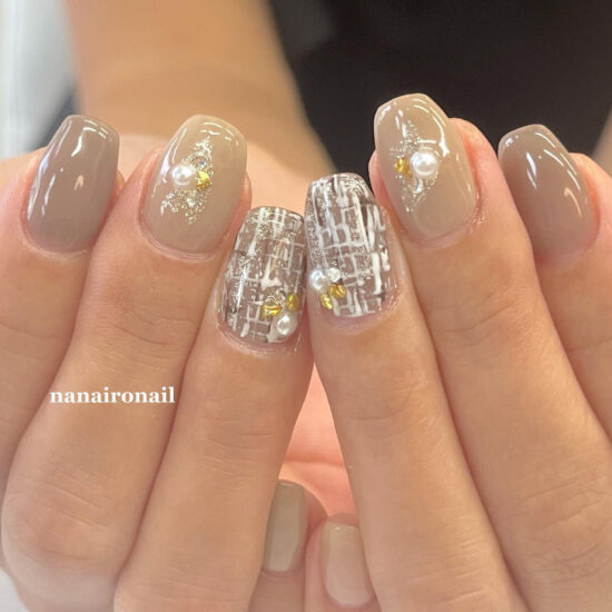 ツイードとパールの組み合わせが品があって秋らし可愛いネイルです。オフィスでも人気なツイード♡是非、nanairo nailさんをフォローしてみてくださいね。
