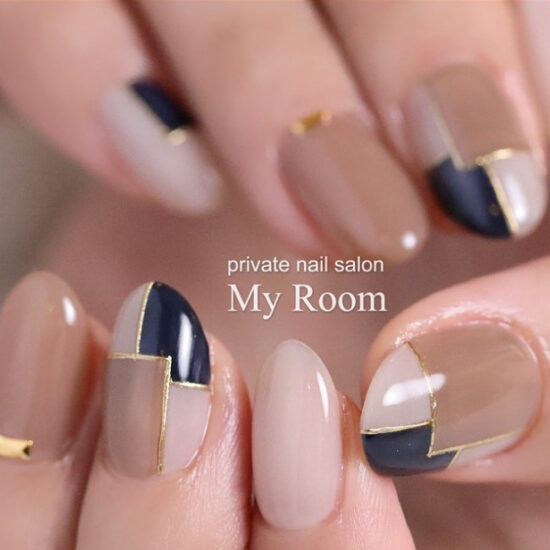 シックで秋らしくてゴールドネイビー、モカベージュの組み合わせが素敵♡是非、YUKA Yoshida nailsalon MyRoomさんをフォローしてみてくださいね。