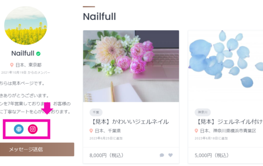ネイリストのページからホームページやインスタグラムを直接チェックできる
